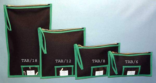 TAB - TAG-A-BAG - These money, bank, coin bags are approximately 12 inches wide.  These are my most popular bags by far!  The standard features are: heavy duty brass zipper, heavy weight #8 duck construction, clear vinyl window sewn on which holds business card size blank paper tag ( provided ) which slides in and out, and a wrist loop (handle) for securely carrying bag.